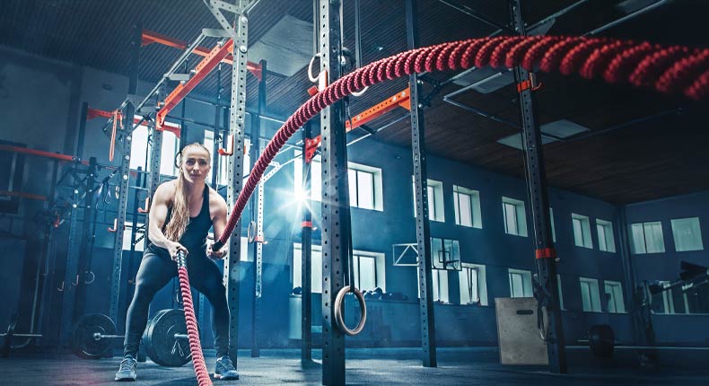 Heavy rope slams, waves, and alternating strikes to build grip endurance, shoulder stamina, and heart-rate control. This mimics the upper-body fatigue of obstacles, burpees, and carries—without joint impact.
